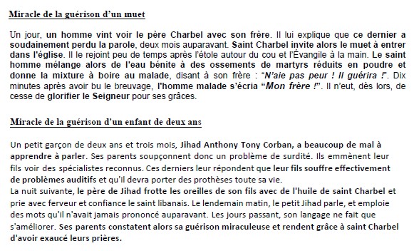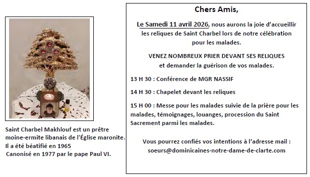 13h30 : Enseignement sur St Charbel – 14h30 : Chapelet devant les reliques