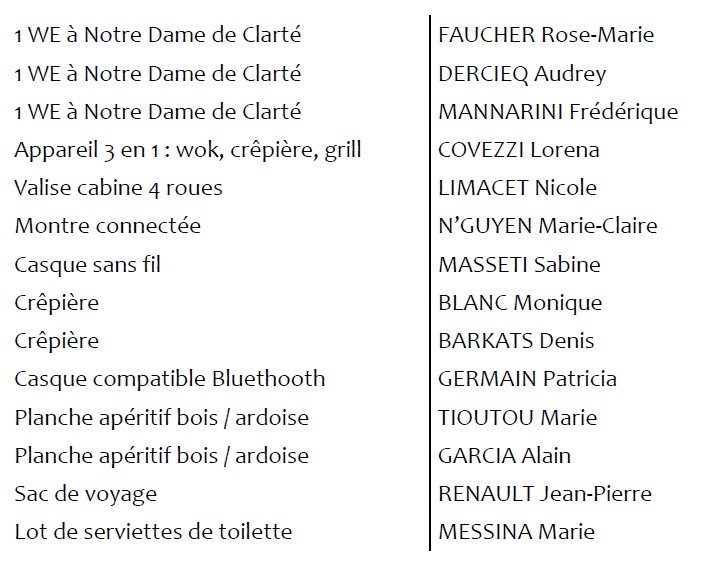 Les gagnants de la tombola (Merci de venir récupérer votre lot avant le 31 décembre 2025)